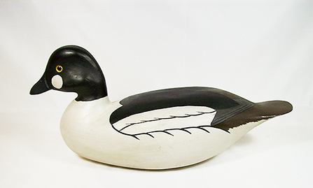 Neat Little Hollow Carved Goldeneye Drake Decoy by Harry V. Shourds (1930 – 2017), Seaville, New Jersey, circa 1981. Shourds was the Grandson of Harry Vinuckson Shourds (1861 – 1920), the very famous decoy carver from Tuckerton, New Jersey. This Hollow Carved decoy with an Inset Weight was made in the Classic New Jersey Form of his grandfather. The Decoy displays Strong Original Paint, Glass Eyes, and Detailed Bill Carving. It has minimal wear. In addition, it is Signed on the Bottom: “H.V. Shourds / 1981”. Measurements: 13” in length, 5” in width, and 6” in height. A Finely Fashioned Decoy by H.V. Shourds. (DX855) Click on Photo for larger images. Contact us for additional information. Price $$245 plus shipping