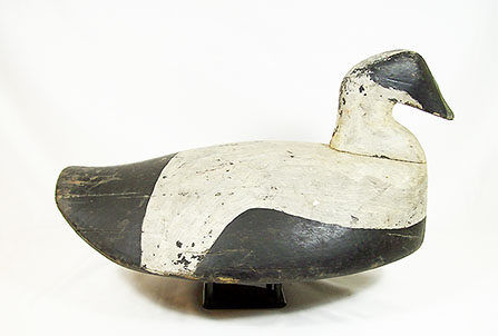 Eider Drake Decoy attributed to John Randall Poole (1886 – 1945) Bristol (Village of New Harbor), Maine, circa 1920s – 1930s. Research indicates that Poole is listed as a Fisherman in the 1920 U.S. Census, as a Carpenter in the 1910, 1930, & 1940 Census. He was married to Carrie B. Poole and, as a young man, lived with his wife at his father’s farm in New Harbor. He died while living in Damariscotta at his death. As a fisherman and a carpenter, it is reasonable to assume that he is the maker of the Eider, Branded J. R. Poole. The Decoy itself is Well Designed with a bold chest, rounded tail, and a very wide body. The Head is not inset, as is typical of many decoys in this area. It has a chip missing from under the bill where the head extends from the body. The Decoys also display a Strong Working Repaint which is again typical of an early working eider decoy. A Horse Shoe is attached to the bottom to provide weight. It measures 16” in length, 10 in width, and 9” in height. No Stand Included. Branded: “J. R. Poole”. A Very Appealing Eider Drake Decoy from Maine. (DX866) Click on Photo for larger images. Contact us for additional information. Price $2350 plus shipping |