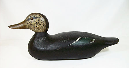 Very Appealing Tackeye Mason Factory Black Duck Decoy by the Mason Decoy Factory, Detroit, Michigan, circa 1920s. The Black Duck offered here displays the Upswept Bill Carving and the Extended Tail indicative of their late model decoys. The Decoy displays Strong Original Paint, including sponging on the body and detailed paint work on the head, and it displays Good Structural Condition, though there is a minor split to the bottom. It has Minor Wear from use as a hunting decoy, including a Few Shot Marks. It has Original Tack Eyes that still show Black Lines from the Paint. The Neck Filler has been replaced. Interestingly, there is a paint rub just below one speculum which was apparently made when the painter was finishing up the white lines on the speculum. Measurements: 16 ½” in length, 5”+ in width, and 6 ¾” in height. Nice Example of a Mason Tackeye Model Decoy. (DX869) Click on Photo for larger images. Contact us for additional information. Price $450 plus shipping |
