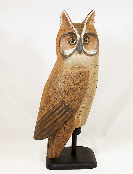 Outstanding Great Horned Owl Folk Art Decoy by Jay Miles, Wells, Maine, circa 2000s. Jay Miles is a Well-Know Decoy Carver and Folk Artist working out of Maine. The Owl offered here is One of his Finest Carvings with its Turned Head Design and its Distinct Features, Bold Glass Eyes, Pronounced Beak, and Raised Tuffs. Raven’s Way has Personally Collected and Sold Numerous Pieces by Jay over the years. This Owl is one of our favorites. It is Exceedingly Well Carved and Boldly Presented. It is Enhanced Not Only by an Appealing Paint Pattern But Also the Aged Look that Jay has created. Finally, Presenting the Owl on its Stand, allows the Owl to Impose its Size by the Extended Tail Carving. The Great Horned Owl is, in fact, an Imposing Creature. The Owl measures 18 ¼” in height, 7” in width, and 6” in depth, with the base somewhat extended in size. This Great Horned Owl is a Perfect Addition to any Folk Art Collection. (DX873) Click on Photo for larger images. Contact us for additional information. Price $675 plus shipping