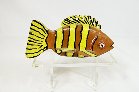 Neat Little 4 ½” Sunfish Spearing Decoy Painted in an Abstract Pattern by Joe Dalton (1936 – 1995), Blackduck, Minnesota, circa 1990s. Dalton’s work is discussed in Donald Petersen’s Fish Decoy Makers: Past and Present. This Solid Little Fish carved from Cedar displays Painted Tack Eyes, Cut Mouth & Gills, a Slightly Curved Wood Tail, and Excellent Original Paint. The Fish is Branded “JD” on the Bottom and Signed “Joe Dalton”. The Fish was originally purchased from Art Kimball back in the early 1990s and kept in our collection until the present. Eye Catching. (FD644) Click on Photo for larger images. Contact us for additional information. Price $95 plus shipping