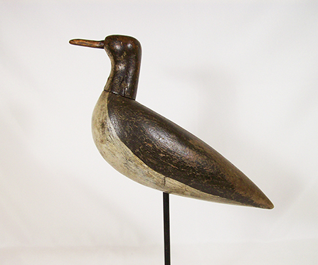 Early Black-bellied Plover Shorebird Decoy by an Unknown Maker from Cape Cod, Massachusetts, circa 1880s – 1900. This Fine Shorebird Decoy which has seen use in the field, displays Strong Original Paint with Wear to the Wood in some places. The Whiteish Paint appears to have been put on rather thinly with no primer; whereas, the Black Paint was placed much more heavily, though both areas show wear. The Decoy is Quite Full-bodied and rather heavy compared to the majority of Shorebirds. A reasonable guess suggests that the bird was made from Mahogany or Walnut, most likely Mahogany. The Decoy is nicely carved down to a Pointed Tail and Each Side of the Tail is Incised to Suggest Primary Wing Separation. The Bill was Dowelled into the Front Head and Held in Place with a Dowell through the Top of the Head. After the Bill was carved down, apparently chip carved, it was split in use and reattached. That Split has been professionally restored and retouched. The photographs should help clarify the description. Measurements: 11” in length, 3” in width, and 13 ½” in height, including the stand. A Fine Cape Cod Black-bellied Plover Decoy. (DX388) Click on Photo for larger images. Contact us for additional information. Price $875 plus shipping