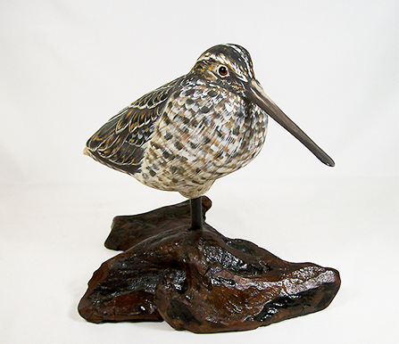 An Eye-Catching Decorative Snuggle Head Snipe Carving by Roy Legaux, Sr., St. Bernard, Louisiana. Legaux is a Well-Know Louisiana Decoy Carver featured in Charlie Frank’s Louisiana Duck Decoys and Loy Harrell’s Decoys: Sixty Living and Outstanding North American Carvers. This Exceptional Snuggle Head Snipe displays a Bold Breast, Subtle Relief Wing Carving, and an Extended Bill indicative of the Snipe. The Highly Detailed Original Paint captures the Exquisite Beauty of the “cryptically patterned” Feathering of this bird of wetland habitats. Measurements: 8 ½” in length, 3” in width, and 7” in height, including the base (8” L x 7” W). An Exceptional Vision of the Common Snipe. (DX1756) Click on Photo for larger images. Contact us for further information. Price $625 plus shipping