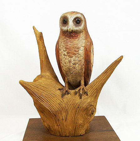 An Amazingly Carved Folk Art Owl found in Pennsylvania, circa 1940s – 1950s. Extremely Well-Carved, we believe this to be the Carvers Vision of a Northern Saw-whet Owl. The Saw-whet Owl is a Very Small and rather Illusive Owl, most often identified by its Song while hidden in the Woods of a Mixed Forest. Completely Worked in Wood, the Carver has Recreated the Owl’s Form, Feather Patterns, Eyes and Toes in Careful Detail. As much attention is given to the Flight Feathers on the Back of the Owl as the Breast Feathers in the Front. The Eyes appear to be Inserted Pieces of Wood and the Toes – 3 in the front & 1 in the back – are delicately carved in wood. The Owl’s Tiny Bill appears nestled in the feathered neck, the size the equivalent of the Tiny Saw-whet. Chip Carving on the Head further establishes the Owl’s Form. Simply Applied Original Paint Mirrors the Soft Plumage of a Saw-whet and creates a Folk-Art Quality. The Carver has further enhanced the dynamic aspects of the carving by the Line Pattern worked into Branch holding the Owl and then Mounted All on a simple Cherry Base. The Owl measures 8” in height (the same as the Northern Saw-whet), 3 ½” in width, and 3” in depth. The total presentation is 13” in height, 8 ½” in width, and 8” in depth. It is most unfortunate that we do not have the name of the carver, but the Sculptural Vision of this Folk Artist speaks volumes about the Lasting Quality of the Work. (DX1758) Click on Photo for larger images. Contact us for further information. Price $1395 plus shipping
