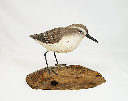 Miniature Semipalmated Sandpiper Shorebird with a Slightly Turned Head by Randy & Elaine Fisher, Dennis, Massachusetts, circa 1981. The Fishers are avid Bird Watchers and have assisted in Bird Banding on the Cape, so they have held many of the birds they create in hand. Apparently, they are now retired from their carving exploits. This Semipalmated Sandpiper Shorebird is approximately 3/4th the actual size of the Sandpiper, but the Detail of the Shorebird is Quite Accurate. The Dimensional Carving offers considerable emphasis to both Primary and Secondary Feathers; whereas, the Line Carving throughout the work provides a “Feathery” Basis for the Paint Pattern. The Slightly Turned Head with an Accurate Bill and Little Black Bead Eyes offers further Realism. The Paint is Fully Original and is Consistent with the Field Marks of the Semipalmated Sandpiper. Standing on a piece of driftwood with a Sense of Anticipation is the Shorebird’s Hunt for the next Morsel. The Bird measures a little under 5” in length, 1 5/8” in width, and 3 ¾” in height, including the base. It is Signed and Dated on the Bottom. (DX1766) Click on Photo for larger images. Contact us for further information. Price $295 plus shipping |