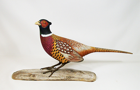 Beautiful Ring-Necked Pheasant Carving by Tom Ahern, Bethlehem, Pennsylvania, circa 1984. Ahern, a Master Carver, has been carving Full Time since 1982. Emphasizing the life-like qualities in his carvings, Ahern focuses initially on Form and Texture, adding animation to the Pheasant’s presentation and enhanced detail to the feather pattern. His carving is then brought to life with an Artist Palette of Dynamic Color, rendering the Pheasant’s Beauty in a Realistic Vision. The Feathering is surely to be admired. This approximately Half-sized Carving measures 14” in length, 3 ¼” in width, and 7 3/8” in height. The driftwood base has an inset weight to avoid any tilting. The Carving is Signed & Dated under the body and the word “Pheasant” is written on the base. A Wonderful Presentation of a Ring-necked Pheasant. (DX1771) Click on Photo for larger images. Contact us for further information. Price $965 plus shipping