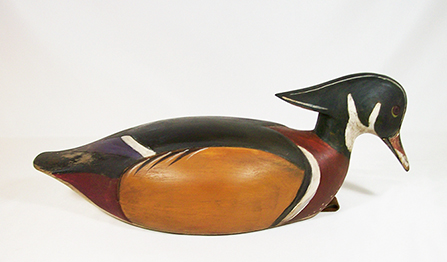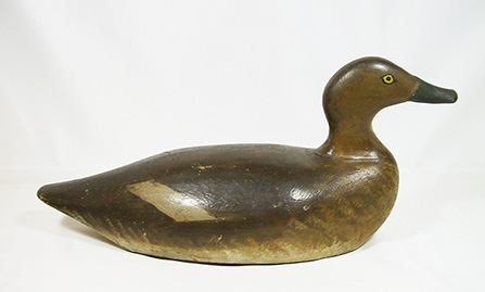 Goldeneye Hen Decoy by Harold A. “Mucker” Davis (1883 – 1967), Waquoit (Falmouth), Cape Cod, Massachusetts, circa 1930s – 1940s. Davis owned the H. A. Davis Boat Co., at White’s Landing in Waquoit, a village in Falmouth. This Goldeneye is one of Davis’s earlier decoys and is quite nicely carved. It was probably made for his own rig. His later work was marked “H. A. Davis, Cape Cod Decoys, Waquoit, MA” and was undoubtedly made for hunters on Cape Cod. This decoy displays Strong Original Paint with Average Gunning Wear; there is a possible repair under the neck. There is also some writing under the tail which is difficult to discern, though the word “Davis” is apparent. The Decoy measures 15” in length, 5” in width, and 6 ½” in height. Nice example of a Cape Cod Gunning Decoy. (DX838) Click on Photo for larger images. Contact us for additional information. SOLD |