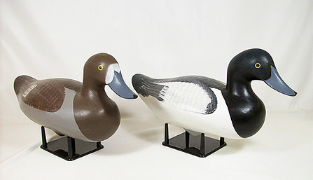 A Fine Pair of Bluebill Decoys by Jim Pierce, Havre de Grace, Maryland, circa 1983. Jim Pierce is a Very Well-Known and Highly Regarded Carver from the Upper Bay of the Chesapeake. His work fits well into the Classic Form of Havre de Grace Decoys and he holds an Honored Place in the Havre de Grace Decoy Museum. These Bluebill Decoys created in 1983 are representative of the Finest Original Paint found on Upper Bay Decoys. Pierce has used thick paints to create Extremely Fine Feathering throughout both the Hen and the Drake, creating a Multidimensional Texture. A rarely seen addition is the use of three different colors on the head designed to capture the fluorescence of the head feathers in bright light. The Quality of these decoys cannot be fully captured in the photographs. Each is Signed: “Jim Pierce / H d Grace / MD / 1983”. Measurements: 14 ½” in length, 6” in width, and 8 ½” in height, including the stands. A Fine Pair of Havre de Grace Decoys. (DX829) Click on Photo for larger images. Contact us for additional information. SOLD |